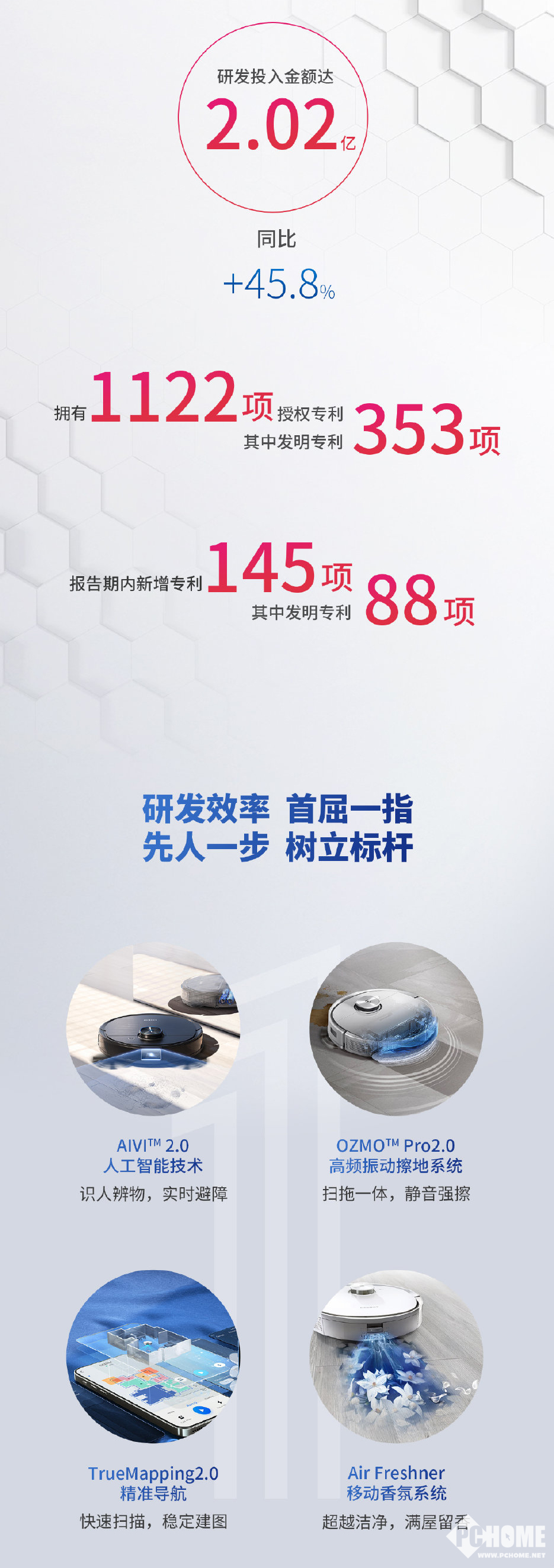 技术研发领域整体投入大2.02亿元,拥有1122项授权专利,其中发明专利达到353项。AIVI™2.0人工技能技术、OZMO™Pro2.0高频振动擦地系统、TrueMapping 2.0精准导航系统以及Air Freshner移动香氛系统都成为了科沃斯扫地机器人在市场上的核心竞争力,也成为了消费者选购科沃斯扫地机器人时的重要因素。