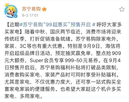 9月3日,苏宁易购对外宣布:9月4日0点起,启动苏宁易购“99超惠买”大促预售活动。