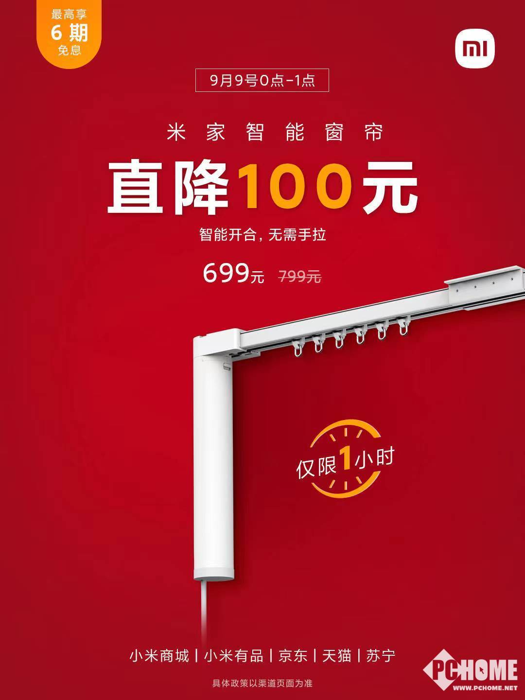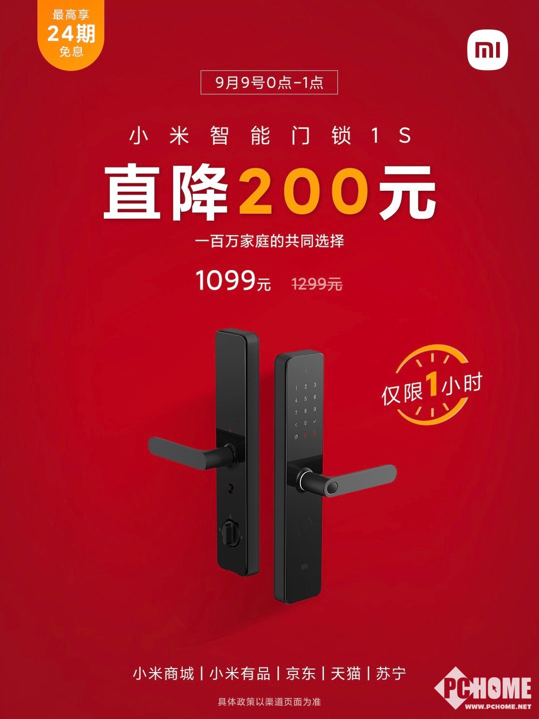 据了解,小米智能门锁1S在明天0点-1点将直降200元,原价1299元,明天入手1099元,最高享24期免息;米家智能窗帘在明天0点-1点直降100元,原价799元,现价699元,最高享6期免息。