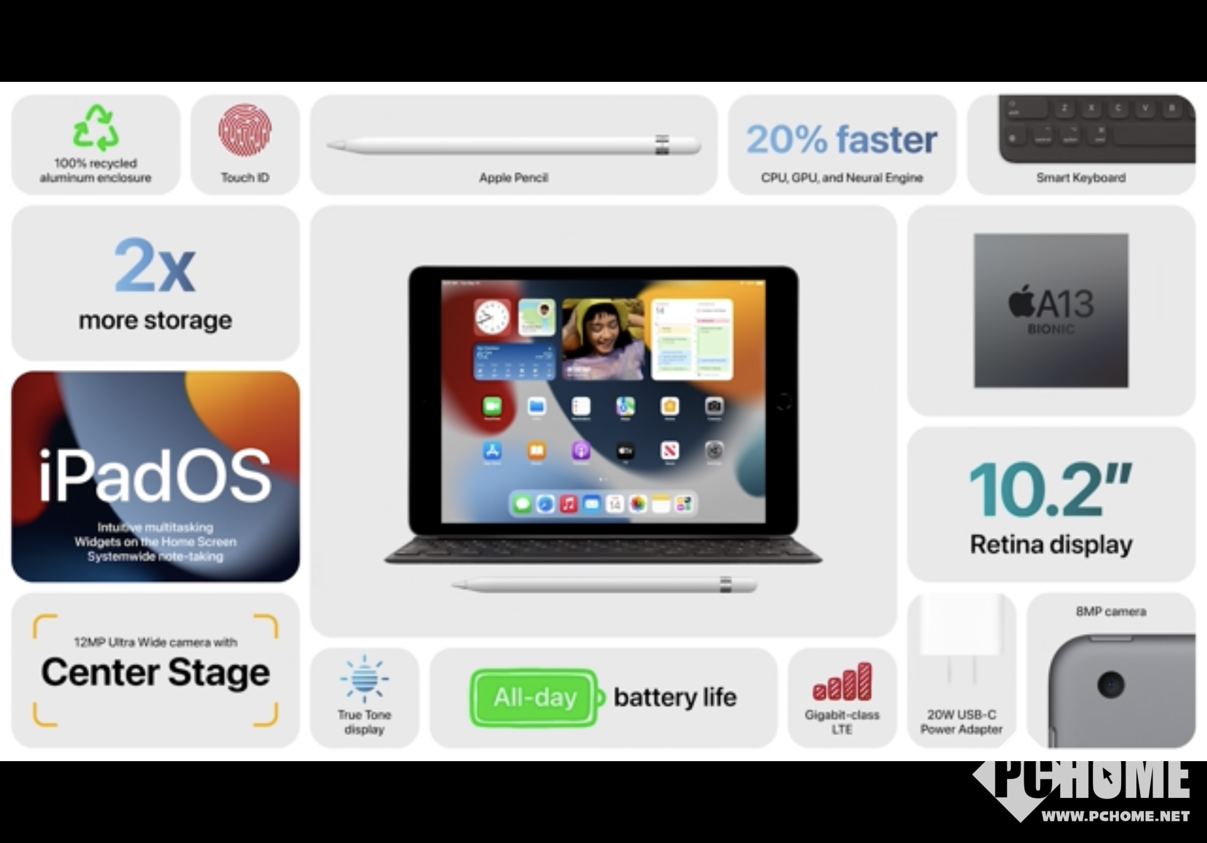 New iPad依旧采用了较老的造型设计,边框部分相对较宽,没有采用更先进的窄边框造型。屏幕方面采用了一块10.2英寸的视网膜屏幕,支持TrueTone原彩显示技术。New iPad的核心升级在于相机部分,采用了1200万像素的超广角镜头,可以实现122°的超广角取景。前置相机部分同样是超广角镜头,并支持在FaceTime视频通话时人物始终居中取景,这一点也与iPad Pro等机型保持一致。