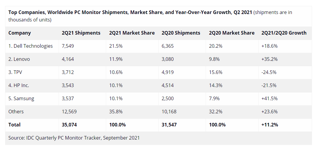 著名市场调查机构IDC公布了二季度PC显示器市场报告。受新冠疫情持续性的影响,全球居家办公和在线学习的用户众多,二季度显示器出货量也在持续增加,达到3500万台,和去年同期相比增长11.2%。另外,受全球芯片缺货持续性影响,显示面板的驱动芯片供应也比较紧张,导致显示器价格也有小幅上涨。