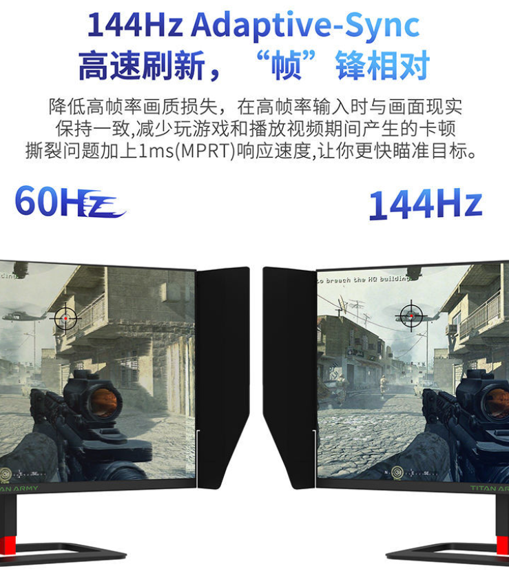 专业的电竞显示器和普通显示器最大的区别,就是在于它具有超高的刷新率,这台泰坦军团T32QG的刷新率高达144Hz,同时支持Adaptive-Sync显示技术,特别是射击类游戏中,有效降低画面卡顿、撕裂卡顿现象的发生。同时屏幕的响应时间低至1ms,可以减小高速运动画面拖影现象的发生。