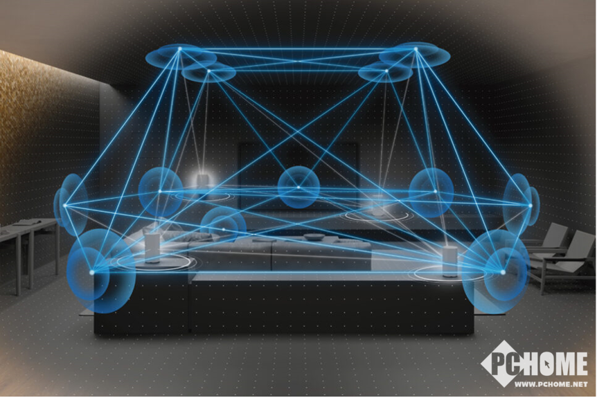 在360空间声场映射技术的加持下,HT-A9利用墙壁和天花板的声音反射,创造出多达12个“幻象音箱”的沉浸音场。音箱正面的上下方各有1个麦克风,用于接收音频信号,再反馈给解码控制器,通过这种声音反馈和360度空间声场,实现自动修正音场、呈现出沉浸式音效。