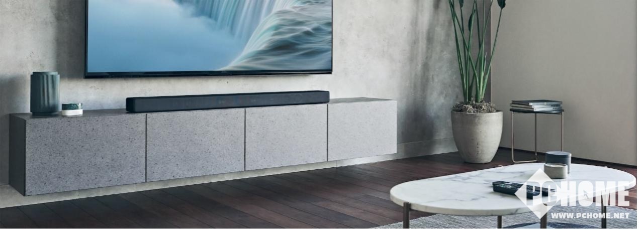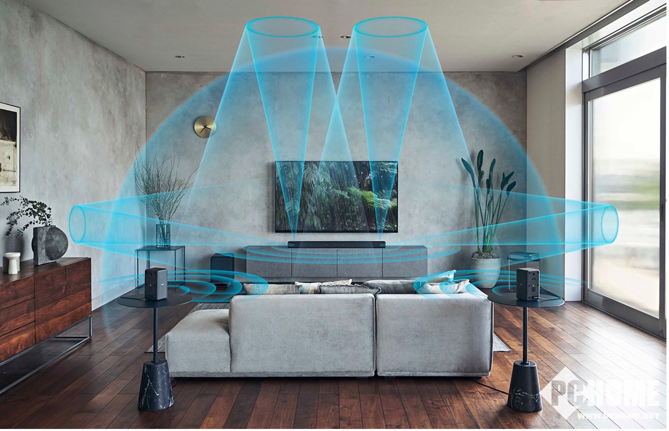 它前方的中央和两侧分别装有2支超低音单元和独特设计的波束高频扬声器,中央的超低音单元使用空间平衡扬声器结构,能扩大声压;而两侧的波束高频扬声器则利用其机体内的高音单体,在发声后通向大小不一的18组小孔,利用每个小孔透出高音相位和时间差,让高音集中、转弯,再投射至侧墙,利用侧墙反射营造出后方的环绕包围感。结合索尼垂直环绕声引擎和S-Force PRO前置虚拟环绕技术,用户能够充分享受杜比全景声和DTS:X®的沉浸音效。