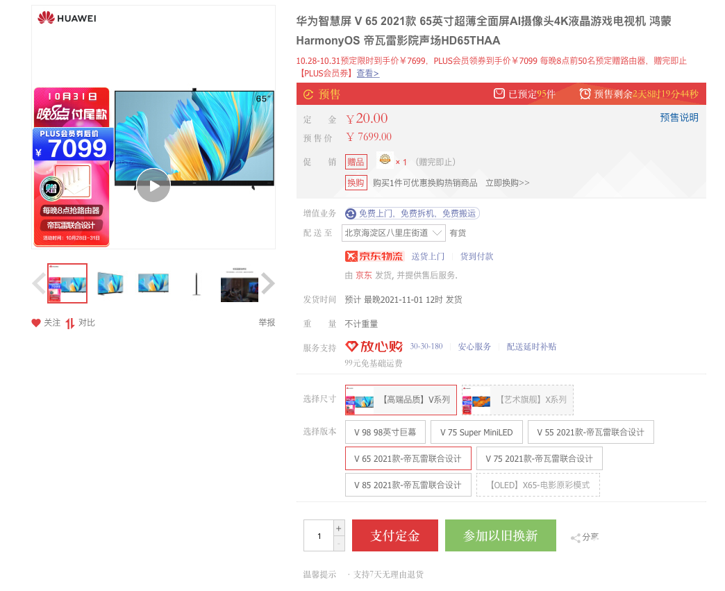 以华为智慧屏V65这款产品为例,原本售价7699元,使用京东PLUS优惠券后立减600元,到手仅需7099元,同时每晚8点开抢还可获得路由器赠品,更是划算至极。