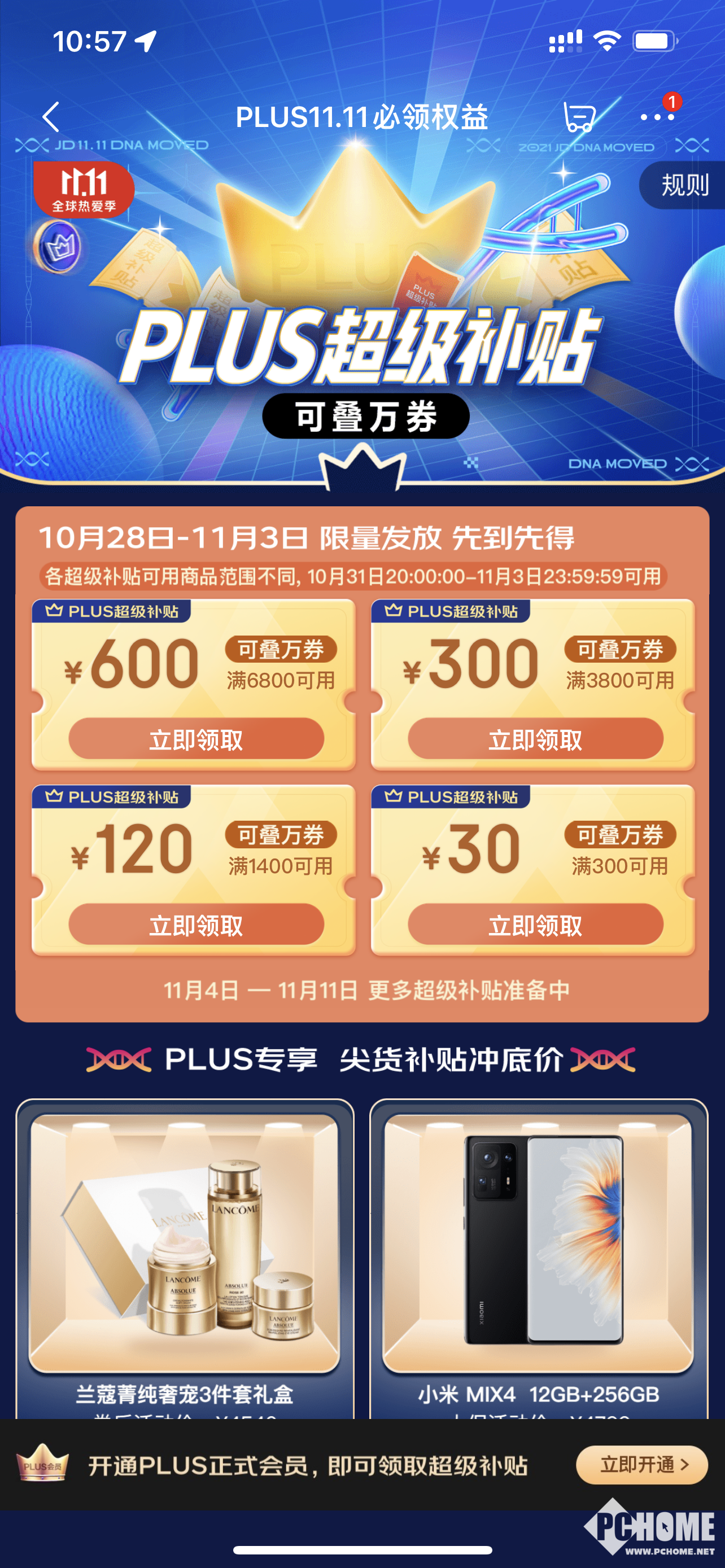10月28日--11月3日,京东PLUS开启超级补贴活动,此次双11补贴优惠券共有四种,分别是满6800元-600元;满3800元-300元;满1400元-120元;满300元-30元,以上优惠券均可叠加其他优惠券使用,可谓是非常超值。