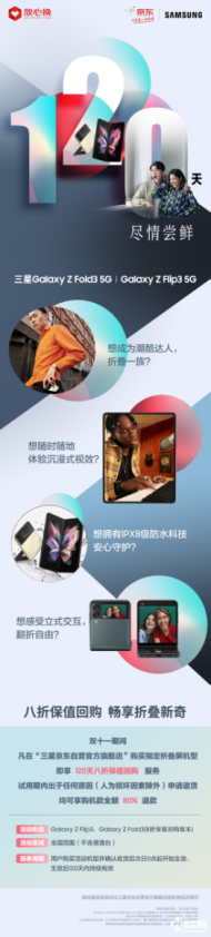 其中,120天8折保值回购服务指购买三星Galaxy Z Filp3和三星Galaxy Z Fold3两款产品,可以在确认收货后直接试用120天,在确认收货后的120天内,用户可以尽情体验新机的各方面性能,如果不喜欢该款手机即可申请退货,除人为因素损坏外,均可获得购机款全额的80%。相较于7天无理由退货,120天的试用时间显然更加充足,用户也能够享受“沉浸式”试用新机的过程。