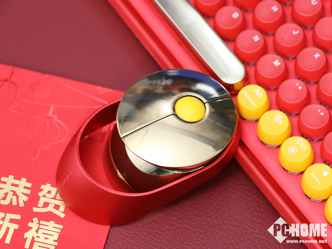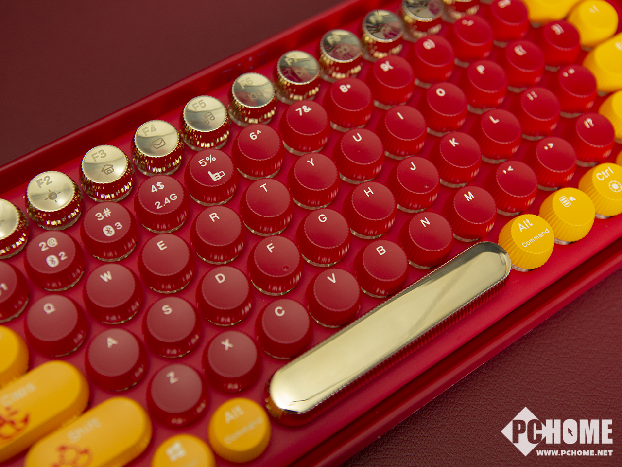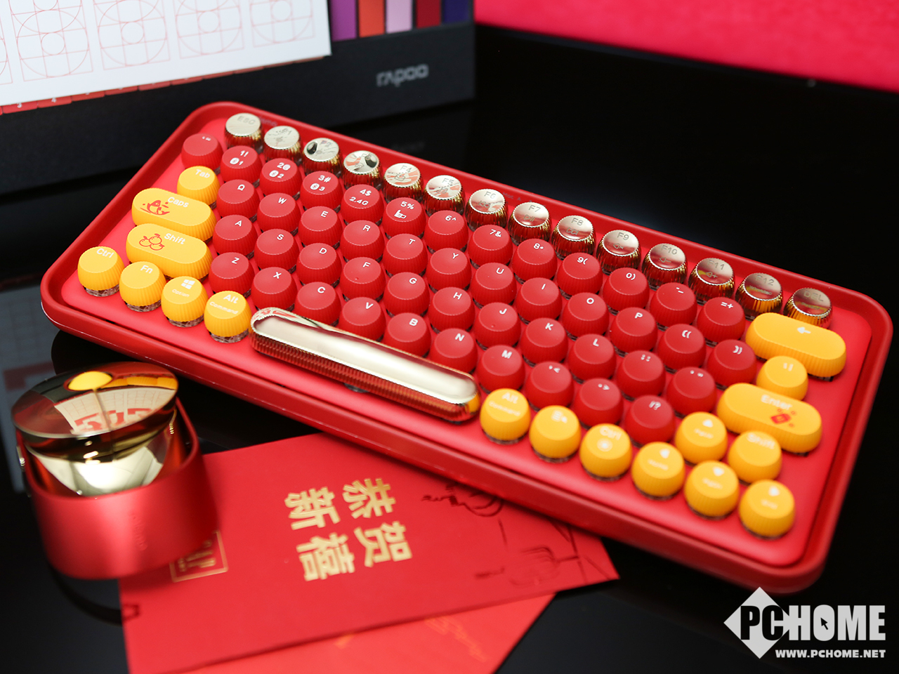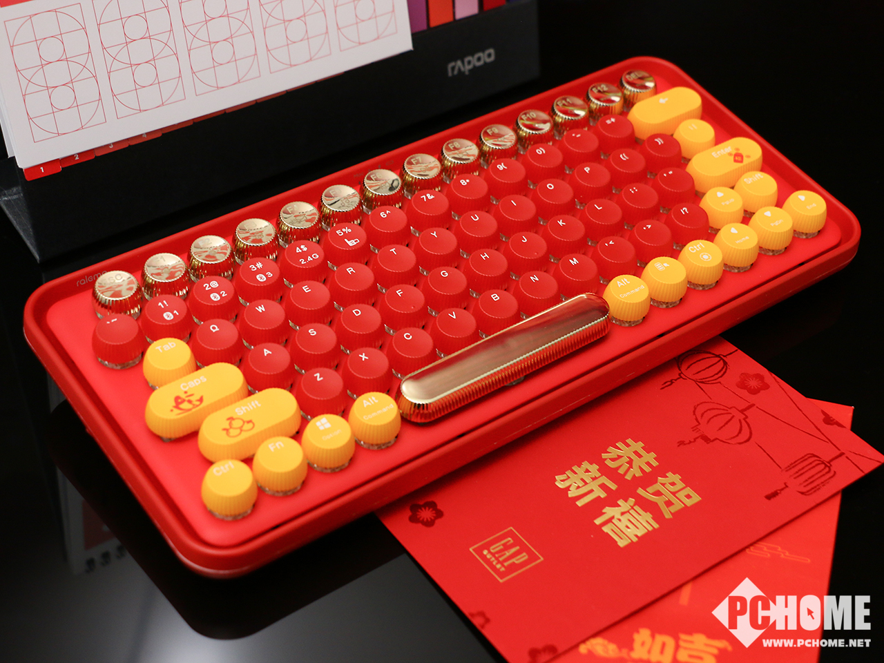 ralemo Pre 5无线多模办公机械键盘新春版的主题色为格外鲜艳的红色,键帽上辅以雍容的金色加以点缀,而第一排的F按键则采用了电镀工艺,在灯光照耀可以呈现出闪亮的光泽。ralemo Pre 5无线多模办公机械键盘依旧采用了标志性的百褶键帽,键程设计合理。同时支持无线2.4G、蓝牙5.0、蓝牙3.0多模连接,最多支持连接5台设备。