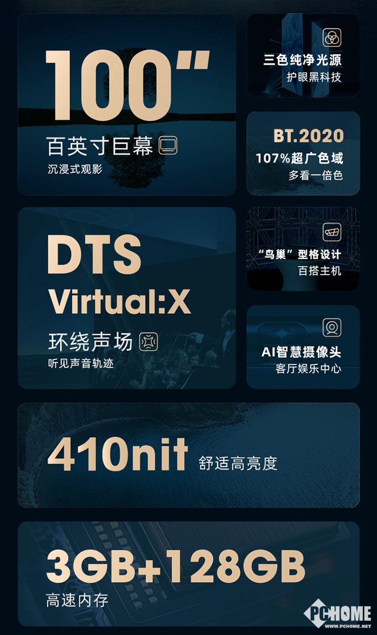 在音质表现上,100L9F主机内采用了多颗扬声器,再加上内置的DTS Virtual:X虚拟环绕技术,高中低音表现都非常饱满、声音位置的精准度很高。配置上同样给力,100L9F搭载联发科MT9639芯片,运行内存3GB,存储内存128GB,系统是基于安卓9.0的VIDAA AI系统,汇集了各大平台的视频资源,并采用DTS Virtual:X环绕声场设计。