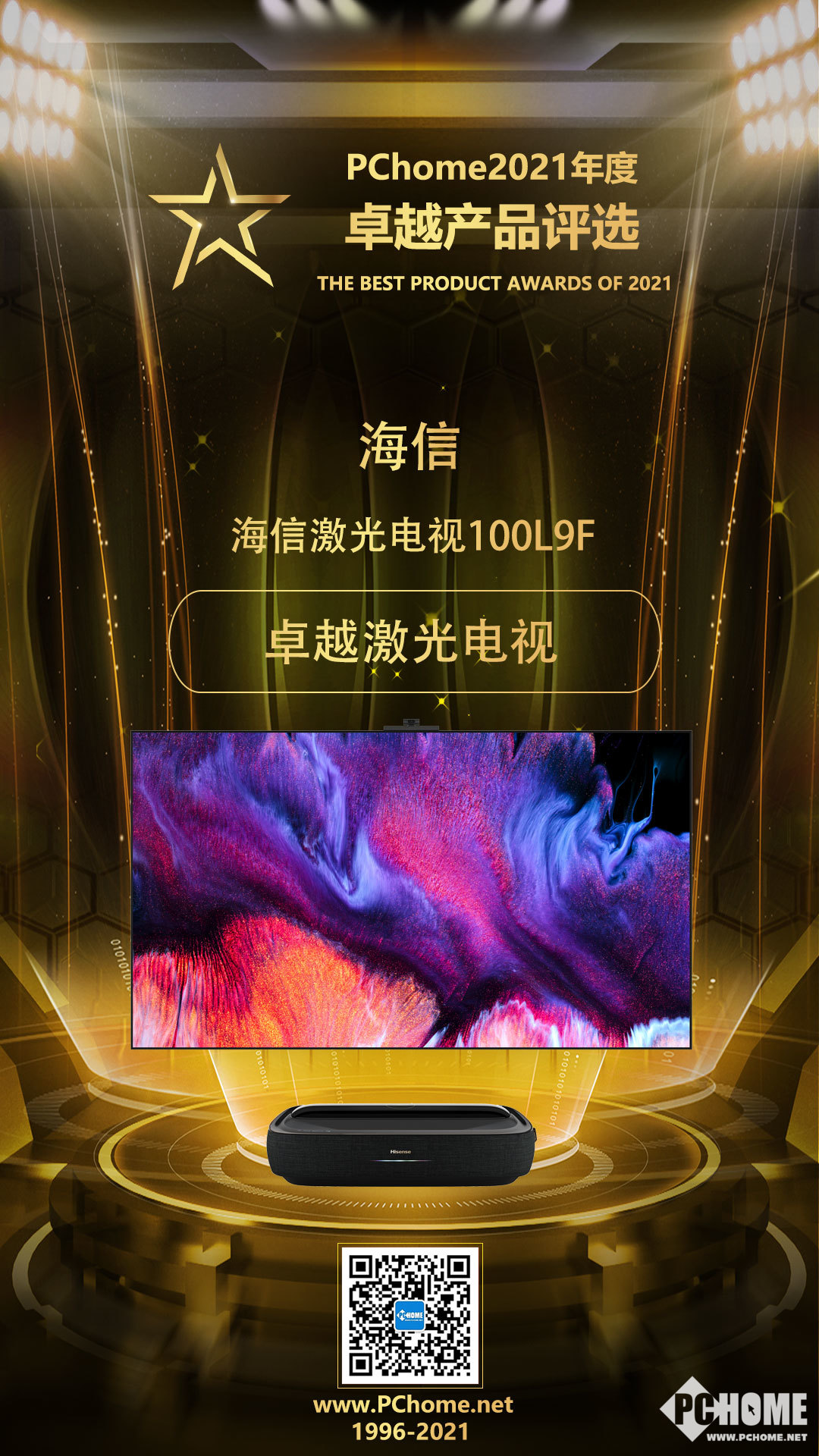 评选结果近期已经揭晓。其中,海信激光电视100L9F荣获2021 PChome“卓越激光电视”奖。该奖项旨对2021年度发布的激光电视产品进行筛选,通过我们的专业深度评测、电商平台评价、第三方研究机构发布的产品满意度调查等,多个维度深度解剖,对参评产品进行的真实评价。