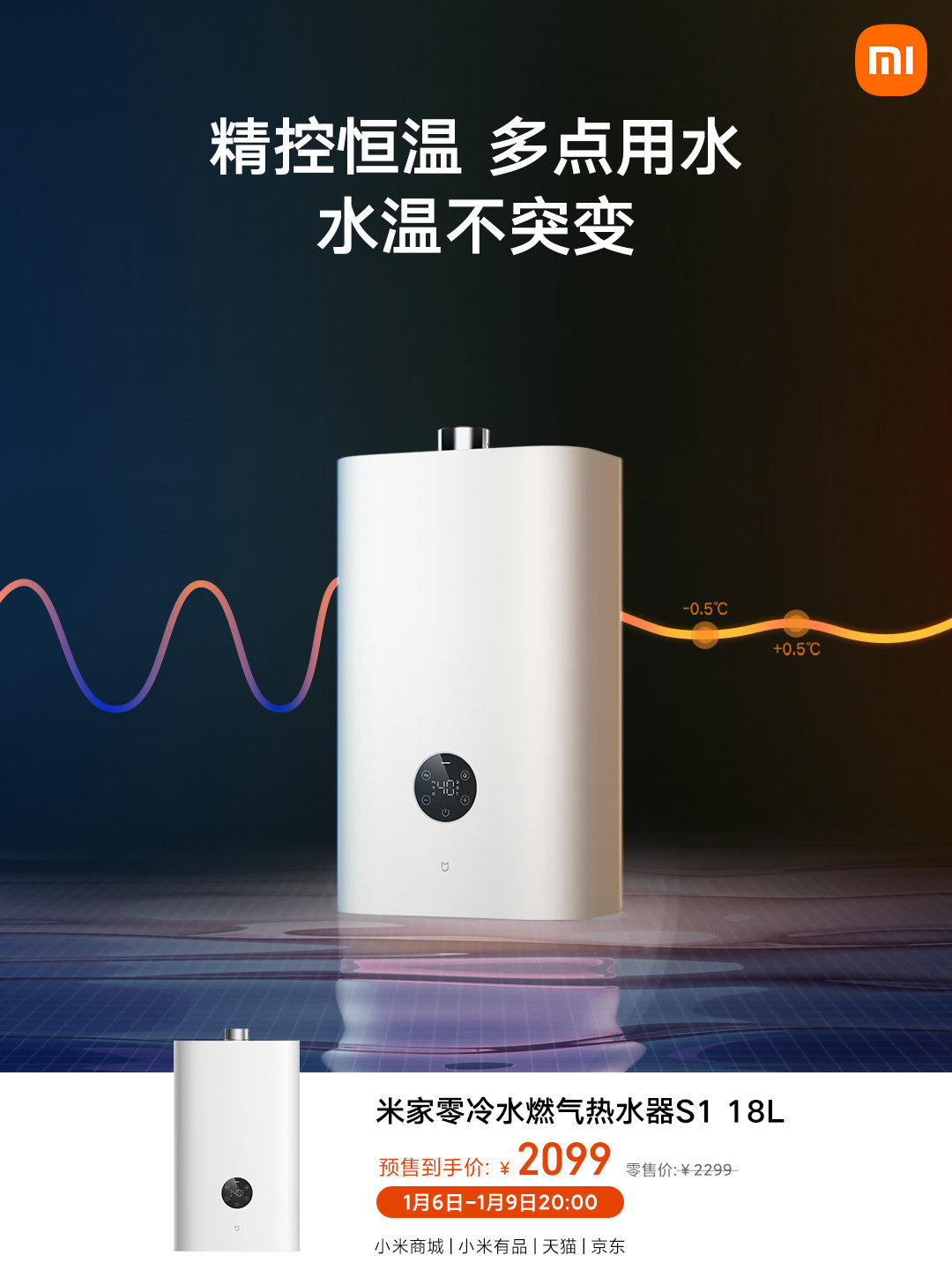 1月6号消息,在去年年尾正式发布的米家零冷水燃气热水器S1 18L在今天再次开启预售,预售到手价2099元,支付尾款前200个订单再减100元。