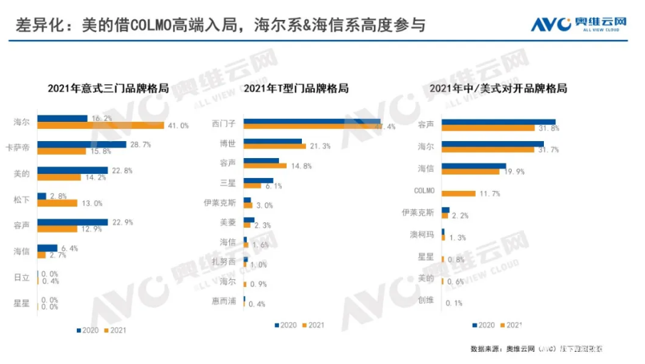 奥维云网线下监测数据显示,自由嵌入式产品零售额占比达11%。同时伴随海尔、美菱、松下等企业的积极参与和投入,自由嵌入的空间优化也在稳步提升。在企业端的积极参与和不断的价格调整过程中,意式三门和中式对开市场发展十分迅速,而T型门也形成了一定的市场规模,传统门体市场有望被差异化产品激活。