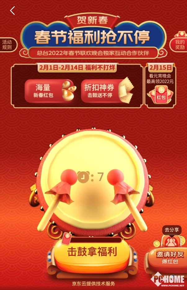 据悉,从大年初七至元宵节期间,“击鼓迎春”全程在线,用户可通过京东APP参与活动领取专属好物福利,一直到正月十五元宵节,用户在总台元宵晚会期间,依然可以来京东领好物、分红包。