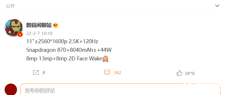 2月9号消息,数码博主@数码闲聊站曝光了vivo首款平板电脑的部分参数。
