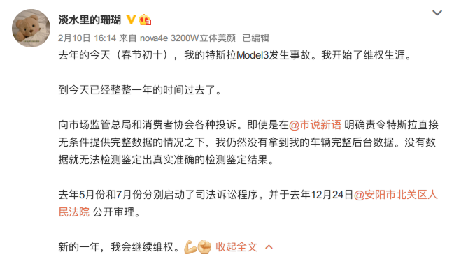 去年4月上海车展站上特斯拉车顶维权的当事人张女士日前于微博发文表示,从其特斯拉Model3发生事故,到今天维权生涯已经过去整整一年了,新的一年将继续维权。她表示现在仍然没有拿到事故车辆的完整后台数据。