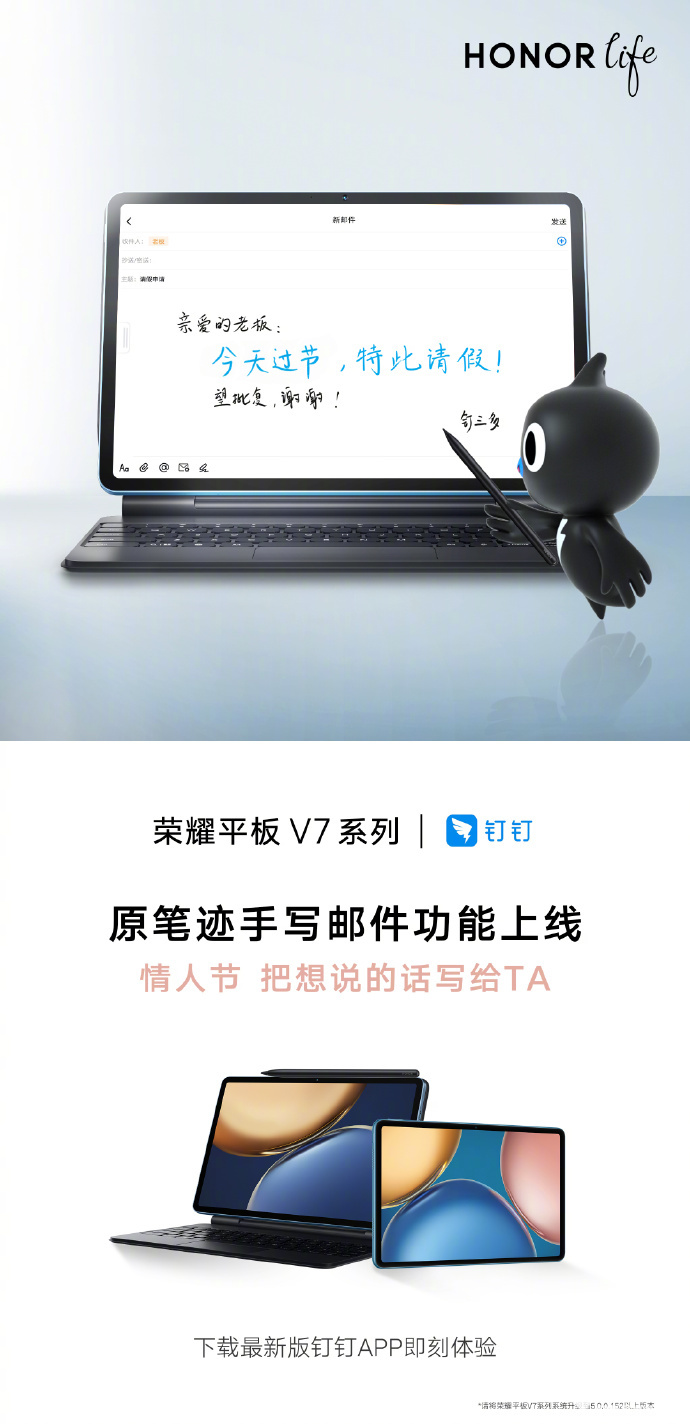 日前消息,荣耀官方宣布荣耀平板V7系列全局手写功能再升级,荣耀平板V7系列与钉钉联合打造的原笔迹手写邮件新功能上线。