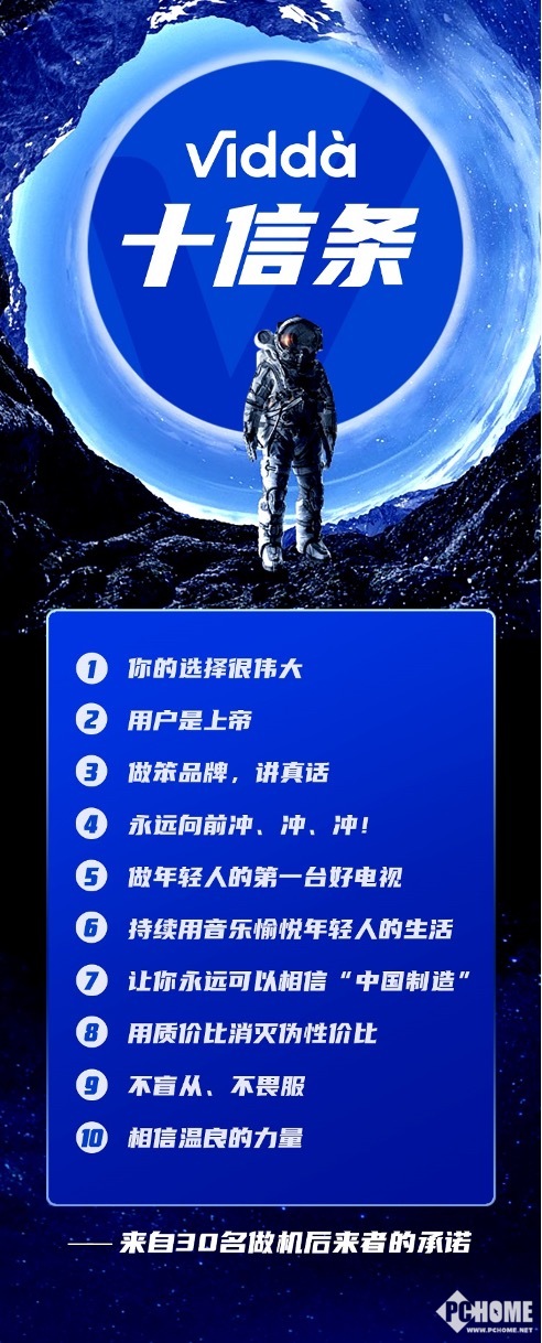 2月15日,Vidda通过官微向全网用户发出十条承诺,其中除了坚持“用户是上帝”、“做年轻人的第一台好电视”等理念之外,还首次提出“做笨品牌,讲真话”、“用质价比消灭伪性价比”等全新口号,引发科技圈网友讨论。而海报中“30名Vidda的做机后来者”的落款,似乎是首次曝光了海信旗下这个年轻潮牌的团队规模。