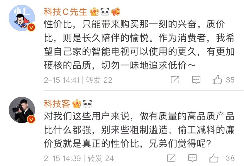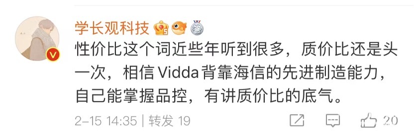 科技KOL“学长观科技”认为,相信Vidda背靠海信的先进制造能力,自己掌控品质,有讲质价比的底气;而另一位网友“科技客”更是犀利,直言对用户来说,做有质量的高品质产品比什么都强。“别来些粗制滥造、偷工减料的廉价货就是真正的性价比。”