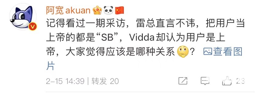 此外,Vidda在品牌十信条中继续强调“用户是上帝”,也引起了大家的关注。有网友翻出了某互联网大佬的相关言论,并与Vidda对用户的态度做对比。做“粉丝”还是“上帝”,相信消费者心中自然有选择。