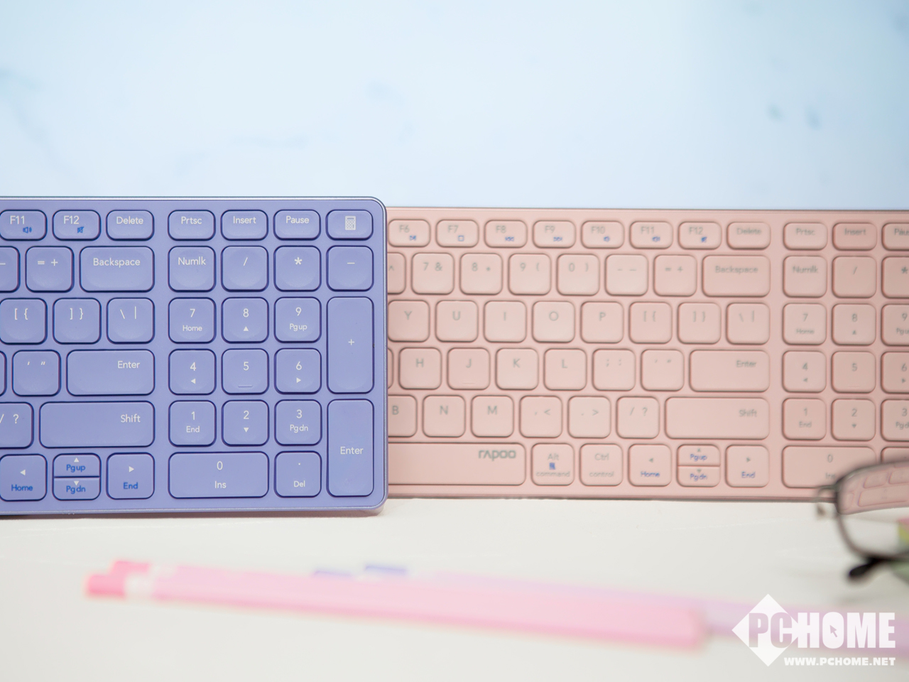 下面为大家带来一组雷柏E9350G多模无线刀锋键盘冷艳紫&流行粉的美图赏析。