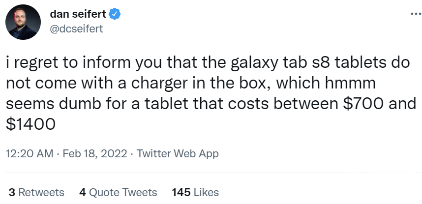 近日消息,据美国科技媒体The Verge的Dan Seifert在社交媒体表示,Galaxy Tab S8系列平板在出厂时包装盒里没有配备充电器。
