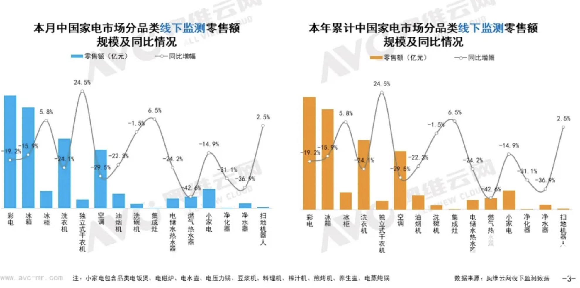 在白色家电各品类中,冰箱、冰柜、洗衣机、独立式干衣机和空调线下零售额规模同比分别为下降15.9%、增长5.8%、下降24.1%、增长24.5%和下降29.5%;