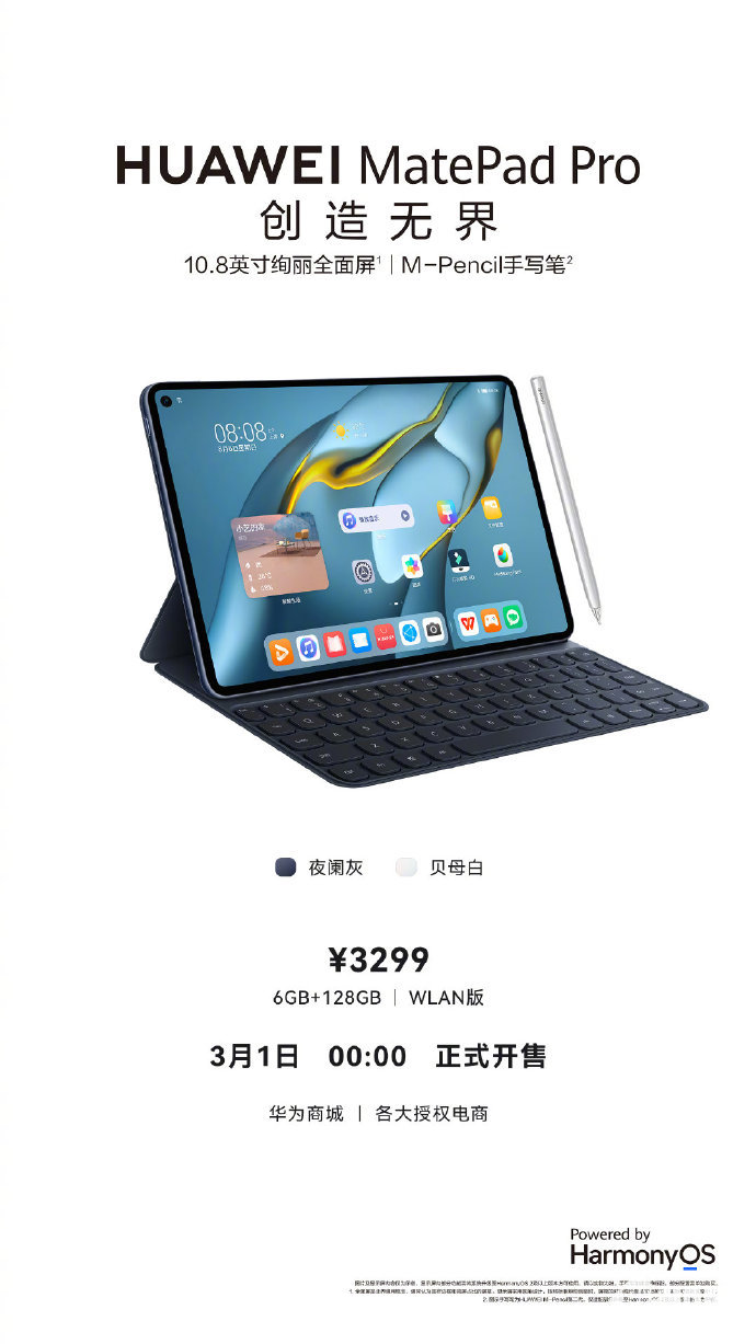 2月28号消息,华为终端官方微博宣布华为MatePad Pro 10.8英寸,6GB+128GB WLAN版将在3月1日0点正式开售。目前这款平板正在预订中,预订立省300元。