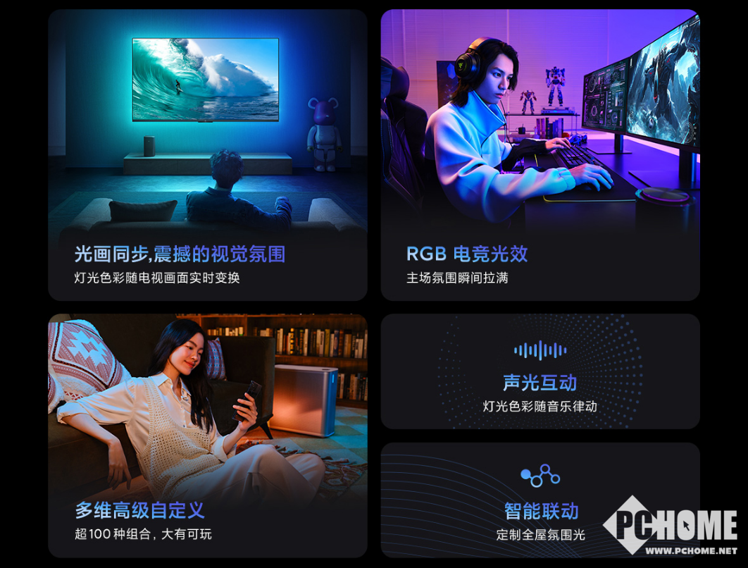 米家追光氛围灯带采用直达芯片底层取色技术,通过光画同步算法,将画面色彩实时转换到灯带。灯带配合小米电视光画同步技术,当主机连接电视大屏,灯光色彩与游戏画面实时同步。