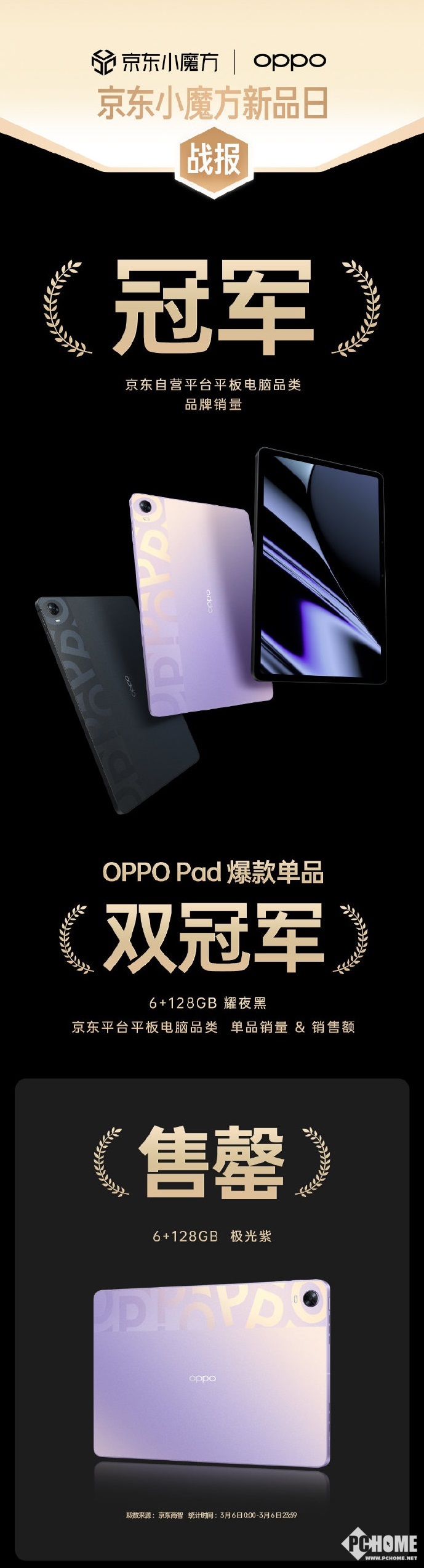 OPPO Pad在昨日再次开售后,今天OPPO智美生活公布了OPPO Pad再次开售的战绩。3月6日6GB+128GB耀夜黑斩获京东平台品牌/单品,销量/销售额等冠军。