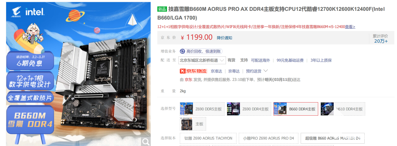 可以说,在1200元的价位段,技嘉雪雕B660M DDR4主板提供了全面的实力,从供电到散热,从内存到接口,几乎没有任何短板,在目前市面上的中端主板产品中竞争实力十足。目前这款主板在技嘉京东自营官方旗舰店热销中,仅需1199元,下单还有多重福利,感兴趣的朋友们可以前往了解更多详情。