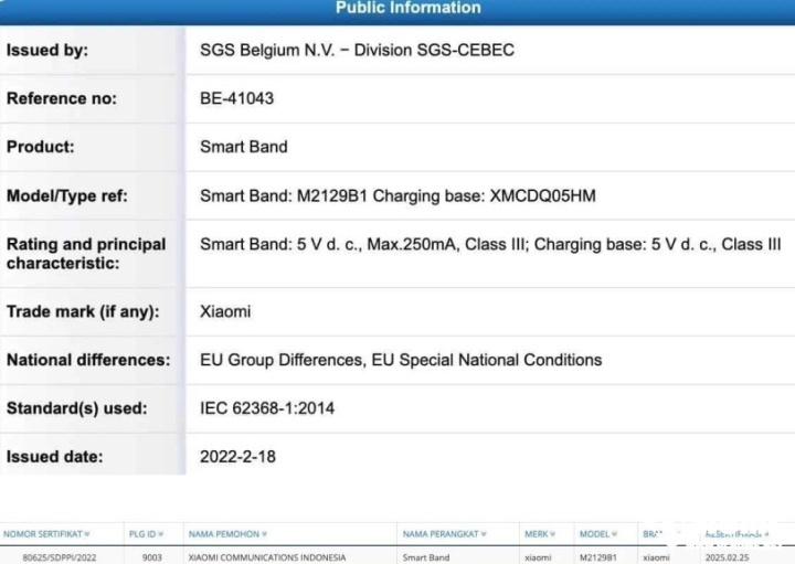 此外,据外媒报道称,小米手环7出现在了比利时SGS-CEBEC和印尼电信网站上,型号为M2129B1。清单显示小米手环7配备250mAh的电池,数据库中显示充电底座的型号为XMCDQ05HM。