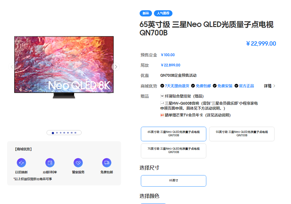 3月30日消息,在三星官网了解到,三星Neo QLED 8K电视QN700B已经开启预售,55英寸售价15999元,65英寸售价22999元,75英寸售价34999元,官网显示预售商品将在4月9