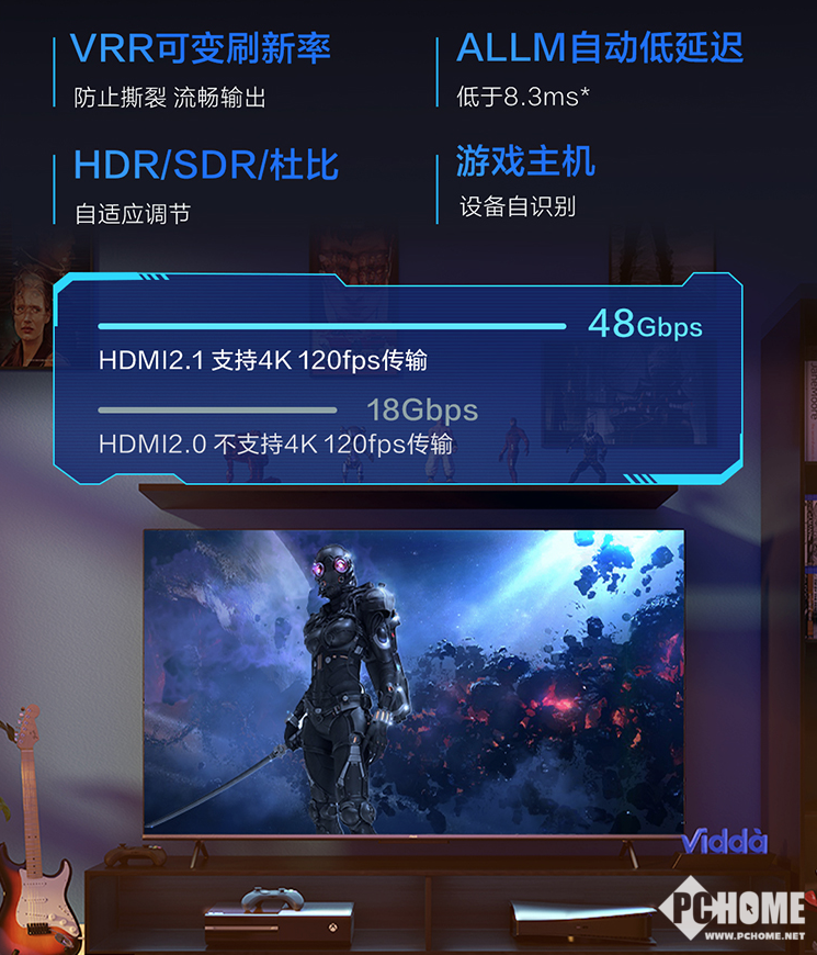 Vidda游戏电视Evo X55采用了一块55英寸的4K分辨率的120Hz高刷新率面板,同时还配备了120Hz的MEMC运动补偿,可以将低帧率内容优化至120帧/s进行播放,通过算法解决画面的抖动以及重影问题,使得观看画面始终顺滑、流畅。同时Vidda游戏电视Evo X55还配备了HDMI 2.1接口,可以实现4K/120FPS的传输,与XBOX/PS5/Switch游戏主机联动后可以实现VRR防撕裂和ALLM自动低延迟畅快效果,让次时代游戏体验更进一步。