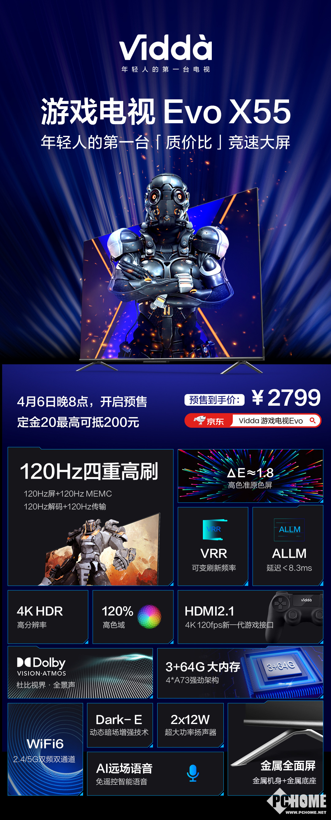 4月6日晚,海信旗下电视品牌Vidda发布了全新的Vidda游戏电视Evo X55,售价2999元,定金20元立减200元,到手仅需2799元。