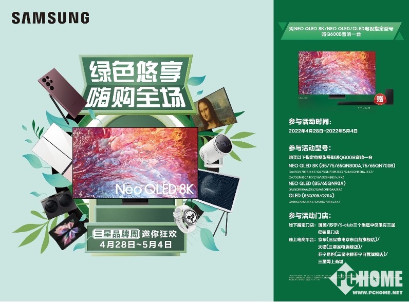 4月28日至5月4日,“绿色悠享,嗨购全场”三星品牌周促销活动强势来袭:活动期间,前往国美、苏宁、S-Club等线下指定门店,或通过三星网上商城及天猫、京东、苏宁易购自营旗舰店购买Neo QLED 8K/ Neo QLED/QLED系列指定型号,即可获赠2022年三星新品音响Q600B一台。