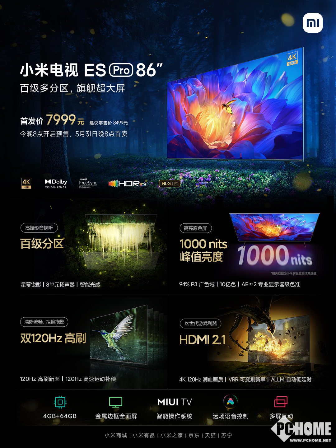 5月23日晚,小米电视正式发布了小米电视ES Pro 86英寸版,首发价7999元。同时小米还推出了小米电视EA 58/60英寸版,售价1699元/1899元。