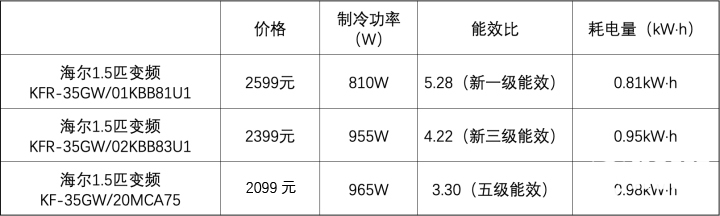 “空调刺客”也就是指空调的不同能效所出现的制冷差距,一般简单的计算公式就是空调制冷功率/1000w·h。那么一级能效与三级能效的耗电量能相差多少呢,我们从京东平台选择了海尔空调中一级能效和三级能效的空调产品来计算耗电量,看看结果如何。