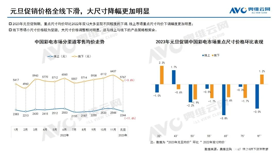 近日消息,奥维云网总结了元旦期间中国彩电市场情况,其表示元旦促销期处于防疫政策全面放开的初期,短期内消费者购物需求减少。线上市场在物流运力不足、快递堆积配送缓慢的影响下,无法保证发货和送达时效。尽管2023年元旦促销彩电重点尺寸均价进一步下调,中国彩电市场量额规模仍为下降表现。