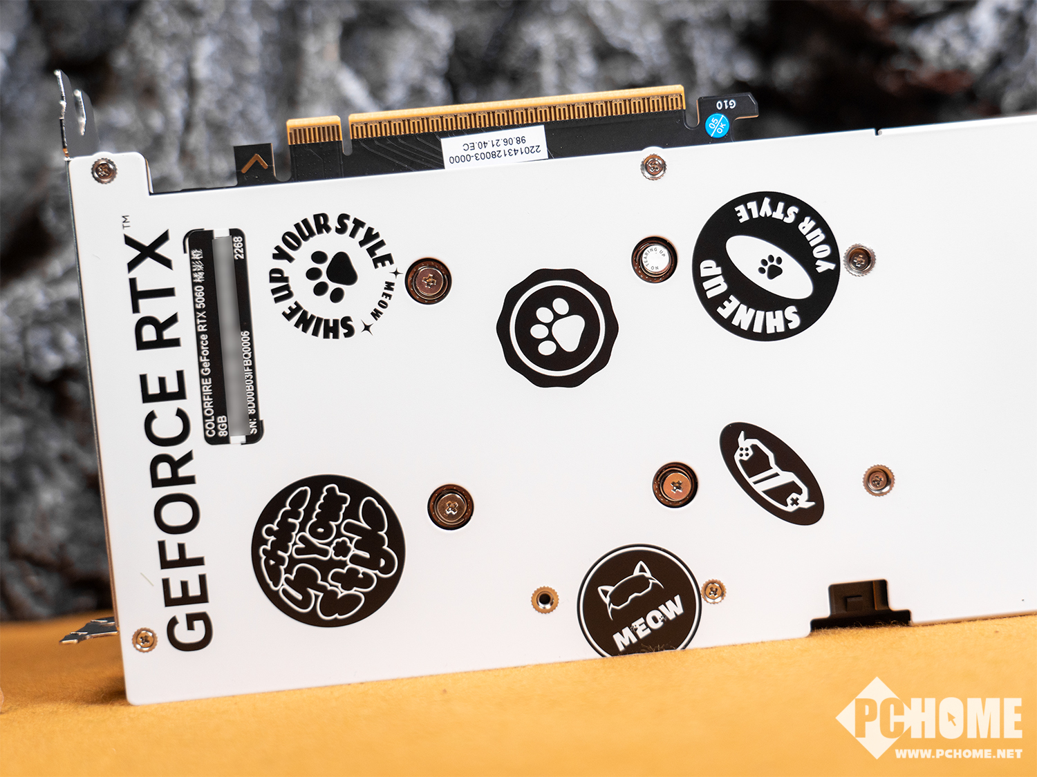 RTX 5060橘影橙设计上也是细节满满,无论是正面的雕刻外壳设计、背板上的萌系图案、显卡尾部的猫猫头以及不同角度显示不同字样的装饰条,都充分展示了RTX 5060橘影橙在设计上的用心。