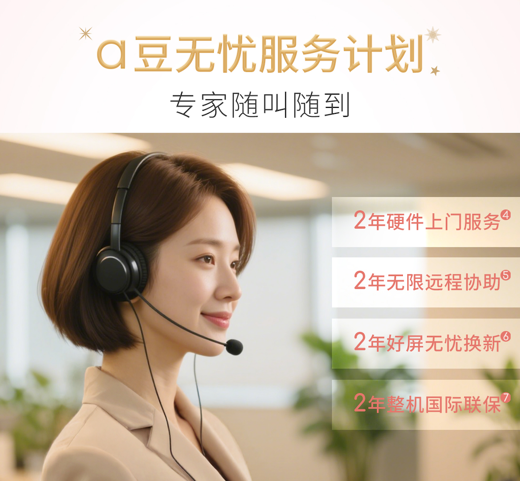 购机即可享受a豆无忧服务计划,包含2年硬件专家上门服务、2年无限远程协助、2年好屏无忧换新、2年整机国际联保,给你安心用机保障。