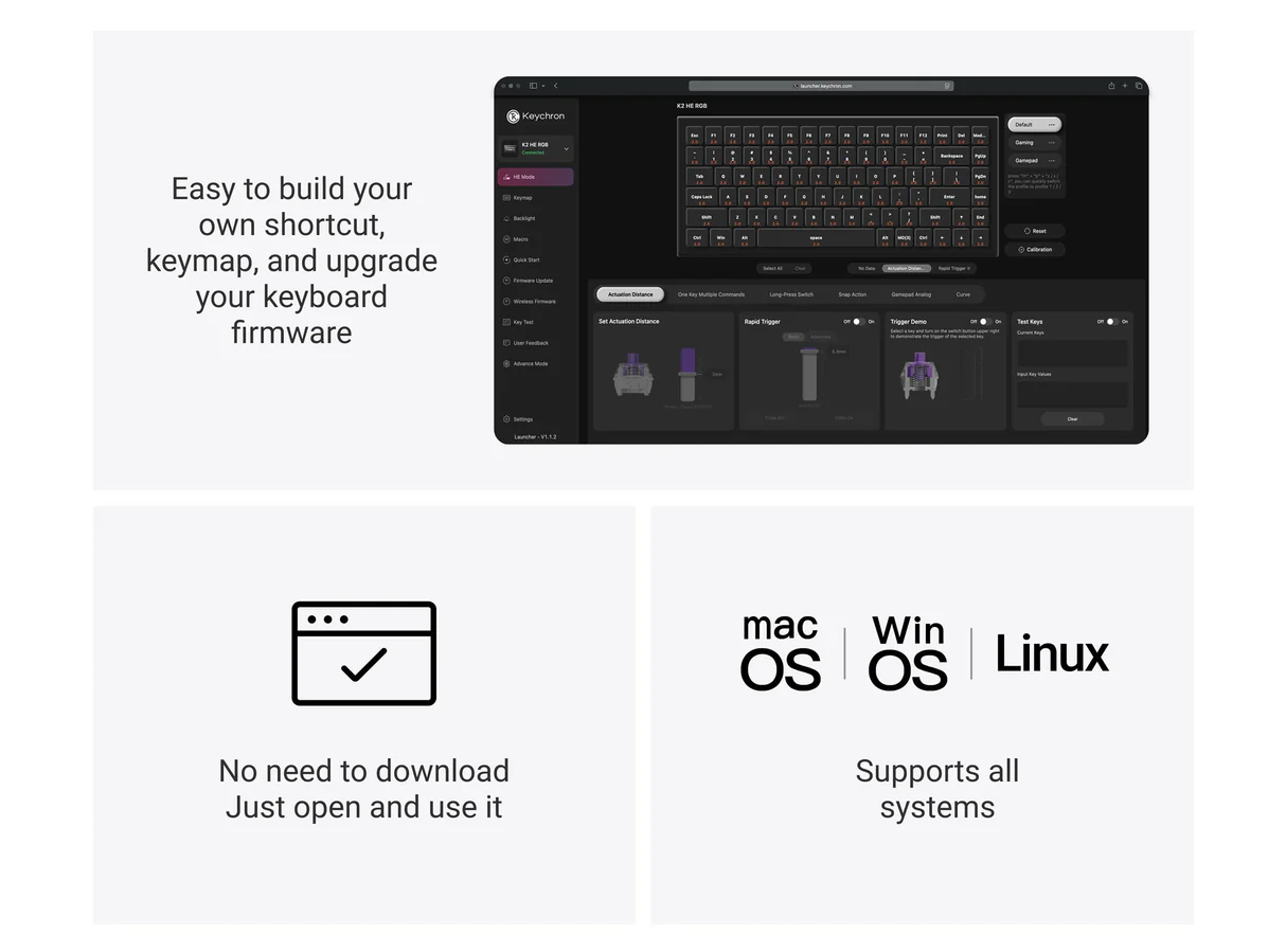 此键盘保留了75%的键位布以及K2 HE系列的全部核心功能,包括可调节触发键程、疾速触发以及360°全向输入控制,同时辅以CNC精雕铝合金侧板。键帽采用可适配macOS与Windows系统的OSA双色注塑PBT键帽,轴体则采用佳达隆双轨磁轴,支持热插拔。