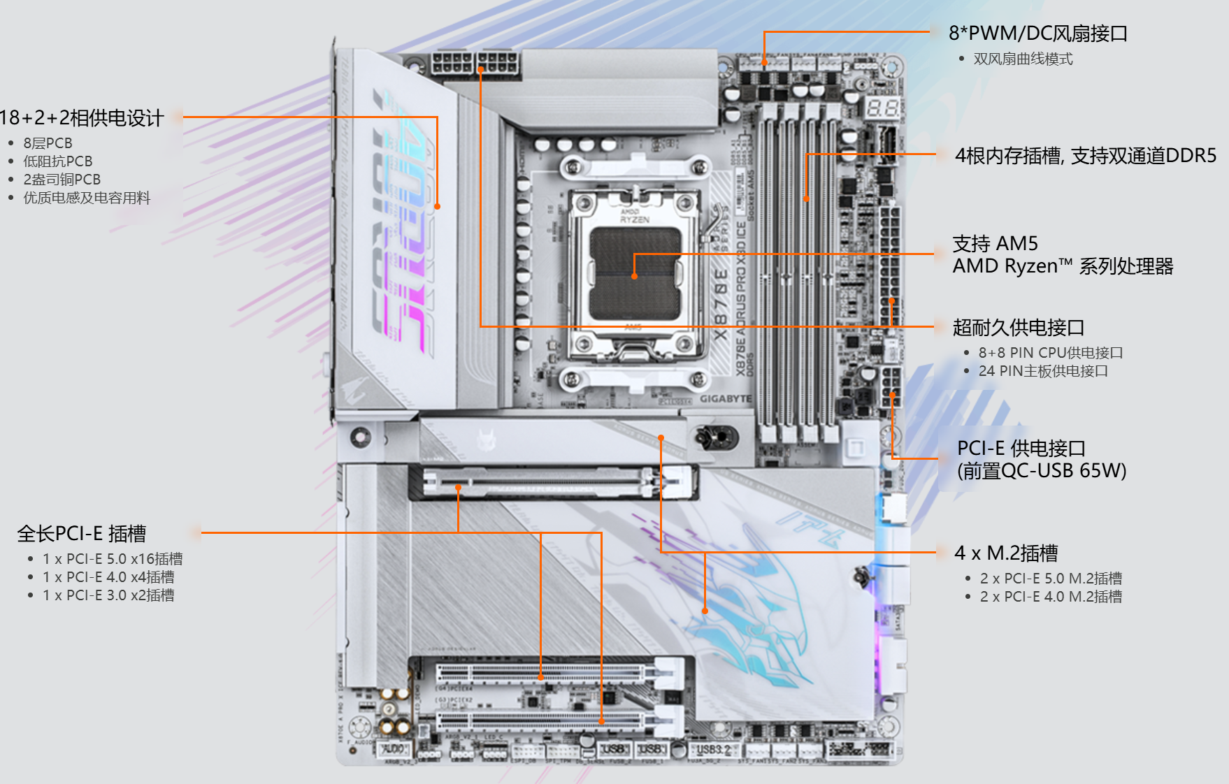 因为白色整机的纯净与素雅,超高的颜值深受广大玩家们喜欢。技嘉X870E AORUS PRO X3D ICE电竞冰雕这块主板从散热装甲,PCB板、内存插槽、PCIe接口、供电接口到固态电容,几乎所有可见部件都采用了纯白设计。