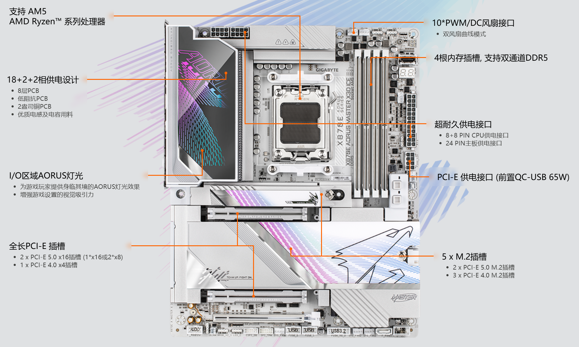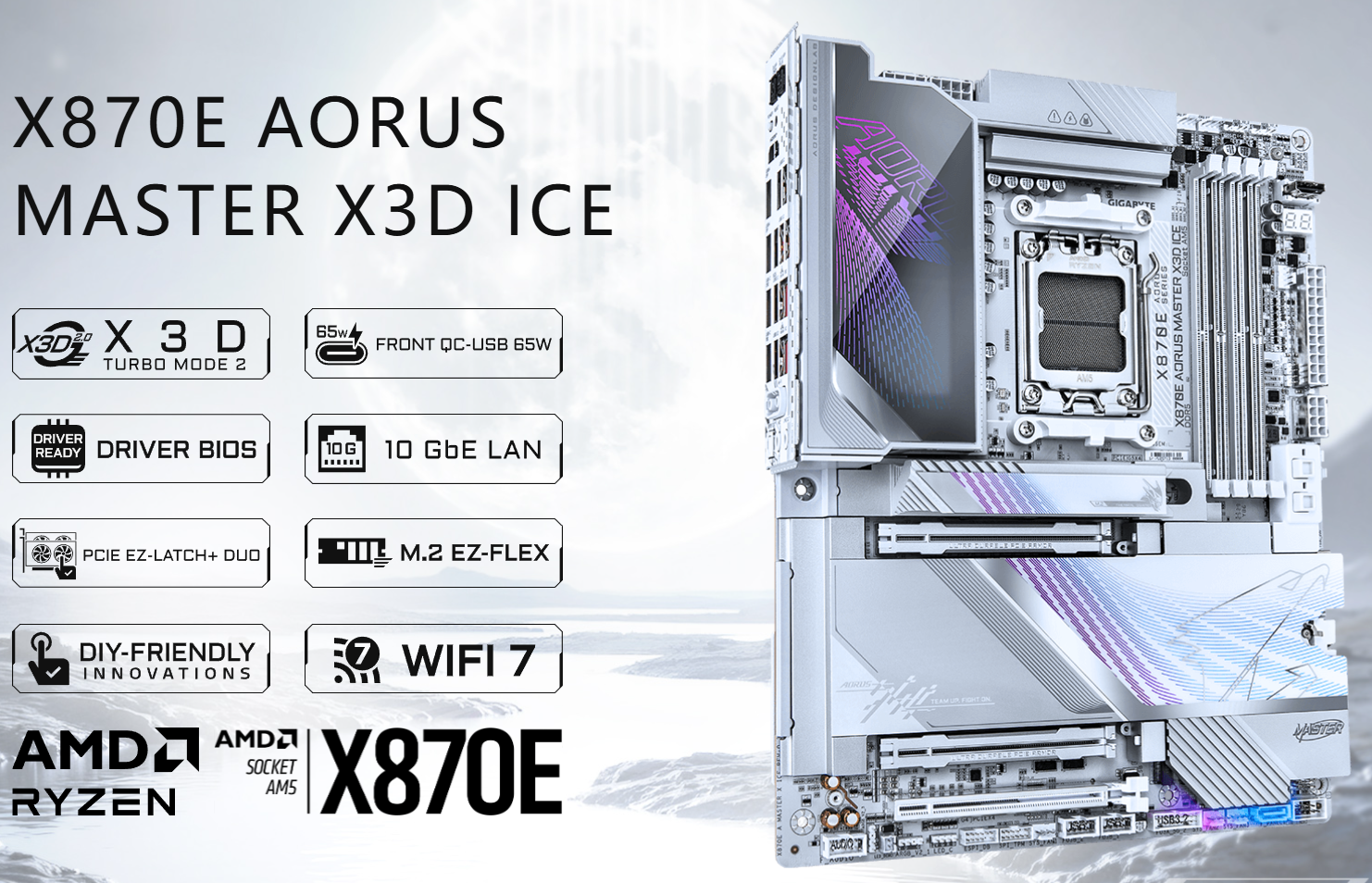 除了X87E电竞冰雕,技嘉也推出了另外一套主板+CPU套装——技嘉X870E AORUS MASTER X3D ICE超级冰雕搭配AMD 锐龙 9 9900X3D处理器。这款主板定位旗舰全能,专为锐龙9000系旗舰处理器设计,提供更加全面领先的性能与扩展性。