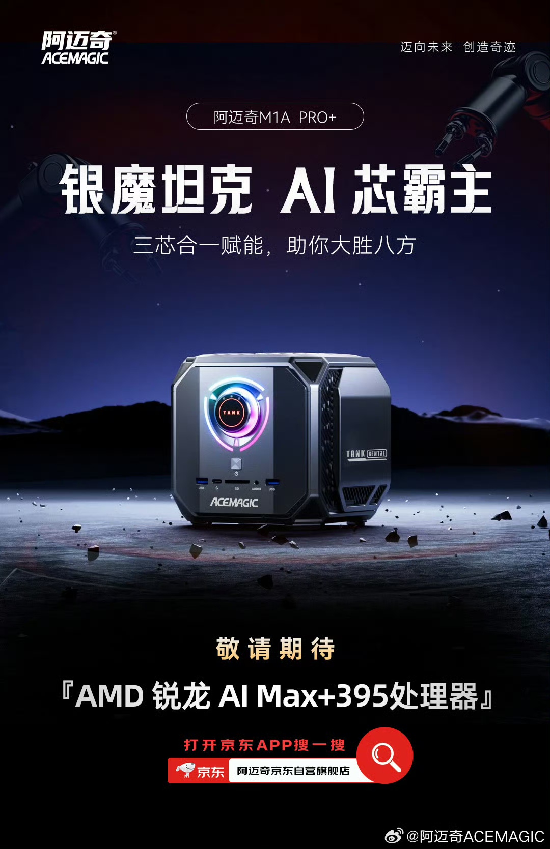 根据阿迈奇官方微博昨日发布推文,阿迈奇即将推出M1A PRO+型号,并首次搭载锐龙 AI Max+ 395处理器,总共可达126 TOPSAI算力。采用科幻感十足的“银魔坦克”方块外观,可配备128GB LPDDR5x-8000内存和12TB存储。