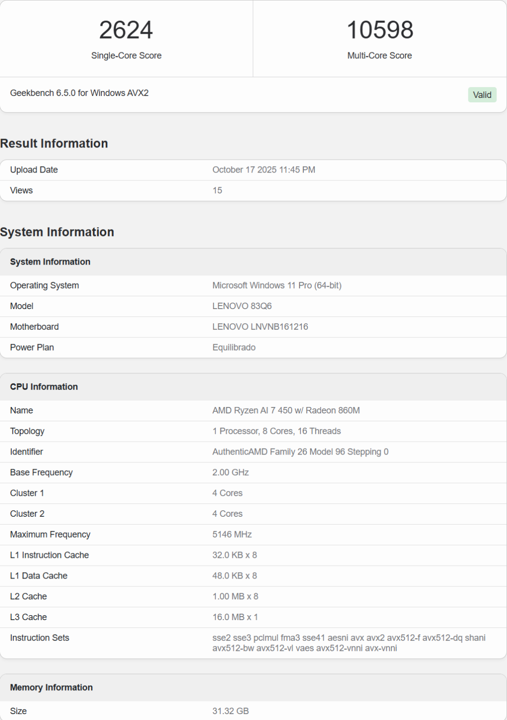 在Windows AVX2环境下,Geekbench单核成绩为2978分,多核成绩为15968分。