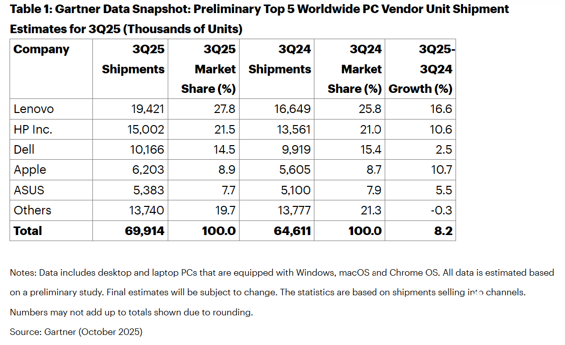Gartner发布的25年Q3全球PC/笔记本厂商份额