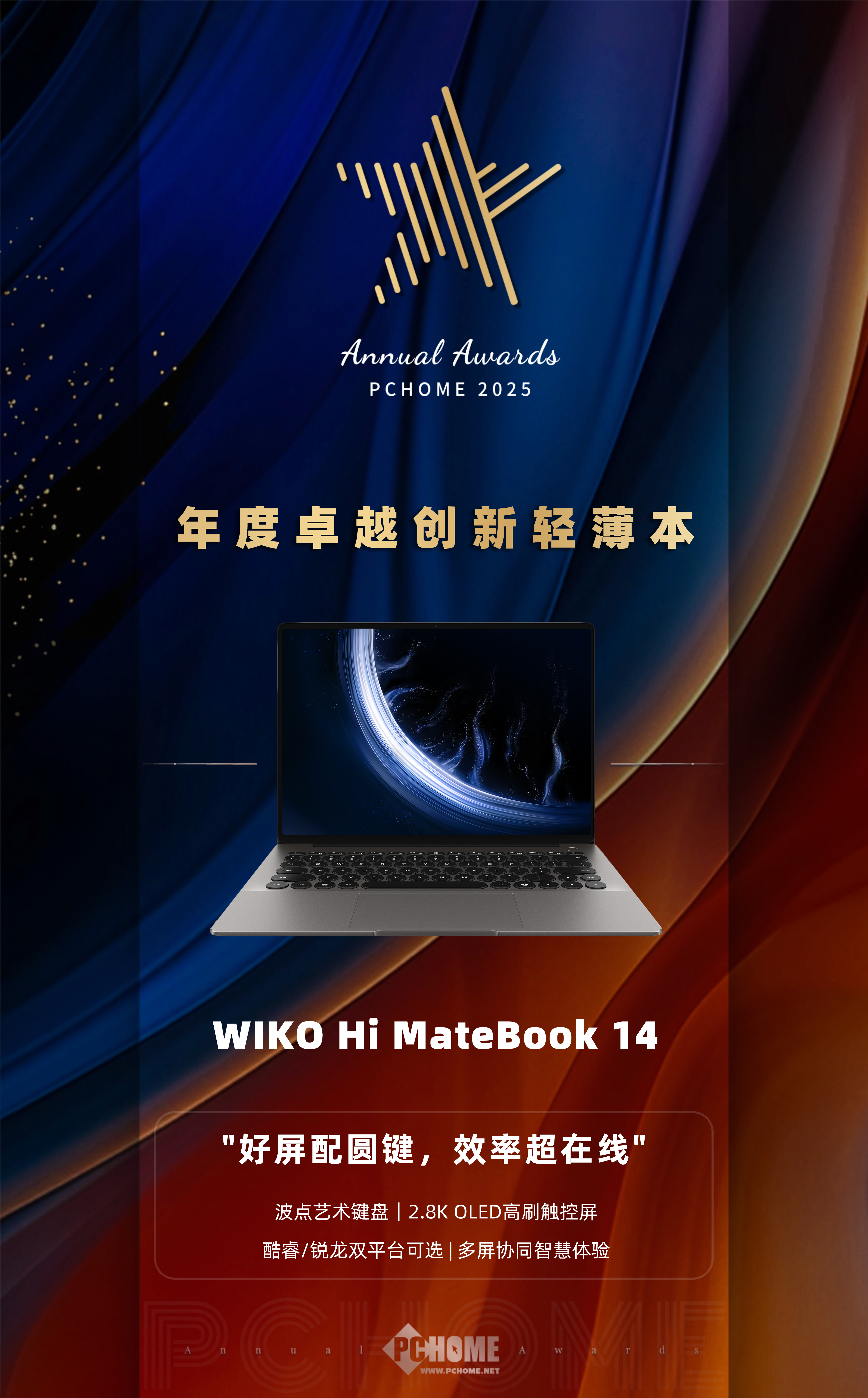 PChome一年一度的年度卓越产品评选已经落下帷幕,2025年度共有数十款产品中脱颖而出,获得年度奖项。在竞争激烈的轻薄本领域,WIKO Hi MateBook 14凭借“好屏配圆键,效率超在线”产品定位,以设计美学、核心体验与智慧生态三个维度的综合创新,成功斩获 “PChome 2025年度卓越创新轻薄本” 奖项。