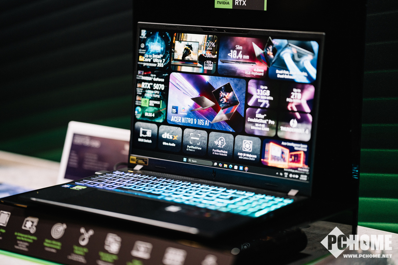 Nitro V 16S AI:主打轻薄,机身厚度不足17.9毫米,重量约2.1公斤,采用金属材质;最高搭载RTX 5070显卡(但未提供RTX 5070 Ti选项)、英特尔酷睿 Ultra 7 355,并配备76Wh电池。