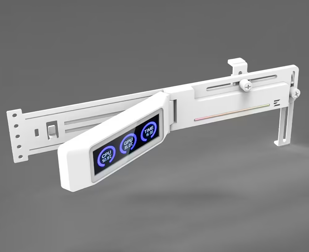 支架整体采用288mm长度与15.5mm深度的紧凑设计,兼顾承重稳定性与兼容性,适用于主流塔式机箱布局。并且配备智能数显面板,于顶部放置可倾斜45°的显示屏,支持实时监控CPU温度、GPU温度及当前时间,方便用户直观掌握硬件运行状态。