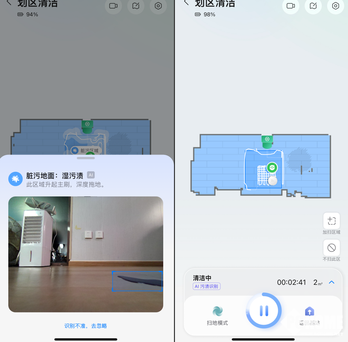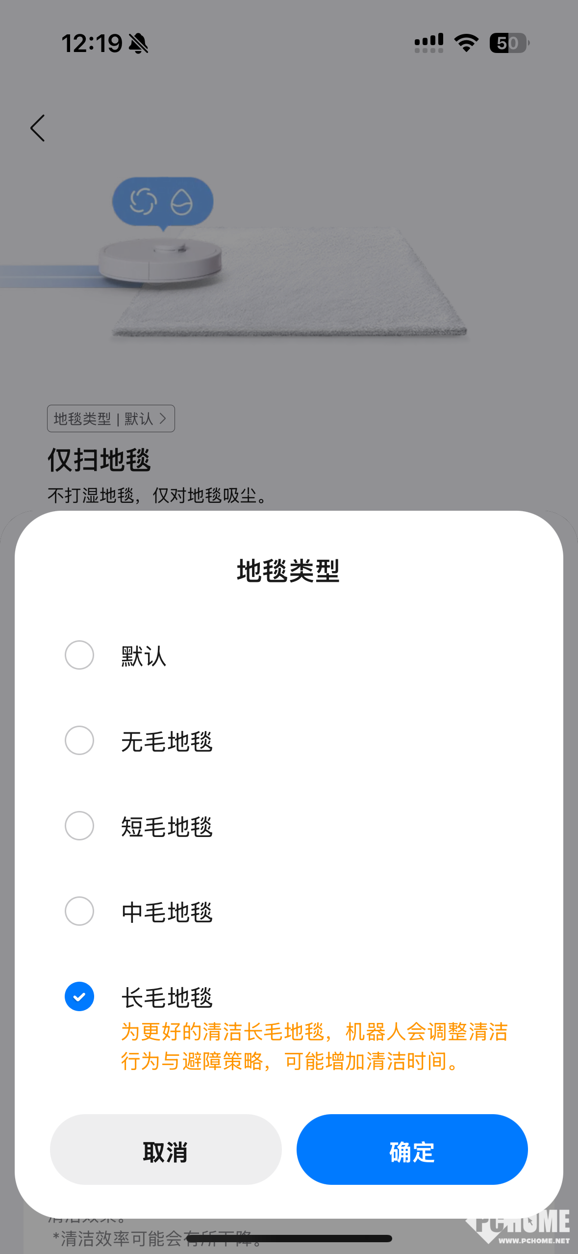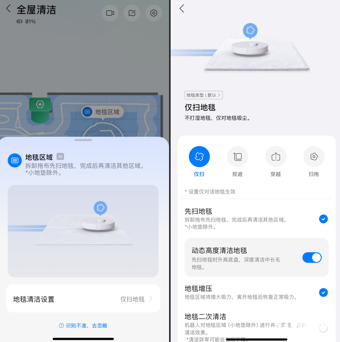 我们可以在App中设置地毯的类型,而且假如家中如果有吸水地垫或者不需要清洁的地垫,可以在App中设置为“规避”。